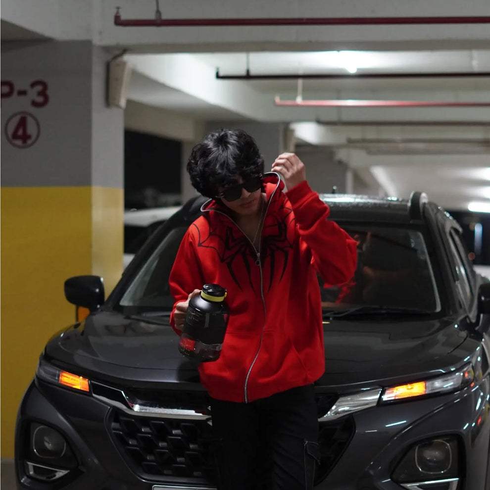 Stand out with this bold and energetic red full-zip web hoodie, designed for fans of streetwear, cosplay, and statement fashion. The hoodie features a dramatic black web pattern across the chest and hood, with a full zipper that extends all the way up to the top of the hood. When zipped, it forms a mask-like look with mesh eye panels for breathability and visibility — perfect for events, photoshoots, or just turning heads.